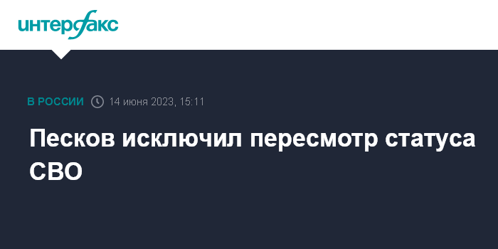 Москва. 14 июня. INTERFAX.RU - Статус специальной военной операции не будет пересматриваться, заявил на брифинге пресс-секретарь президента Дмитрий Песков.