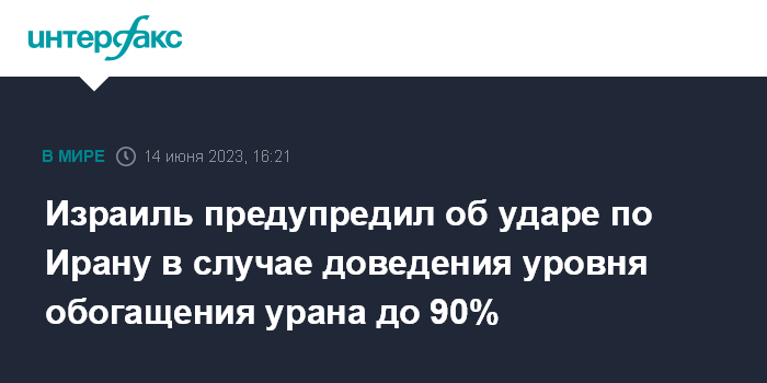 Москва. 14 июня. INTERFAX.RU - Израиль нанесет удар по Ирану в случае, если он будет обогащать уран до уровня в 90%, сообщили израильские СМИ со ссылкой высокопоставленного представителя еврейского государства.