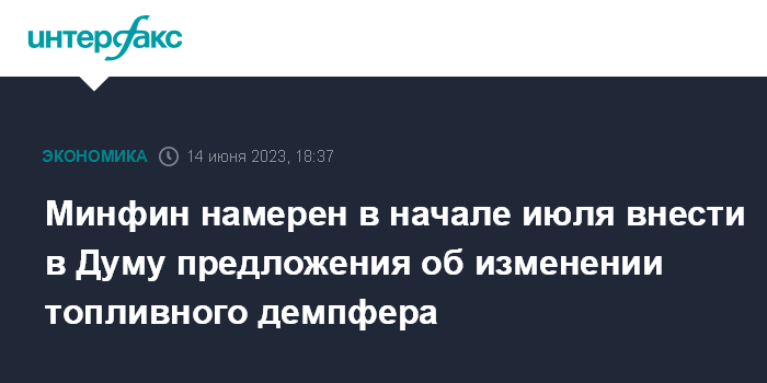 Москва. 14 июня. INTERFAX.RU - Министерство финансов рассчитывает в начале июля внести на рассмотрение Государственной думы предложения об изменении топливного демпфера.