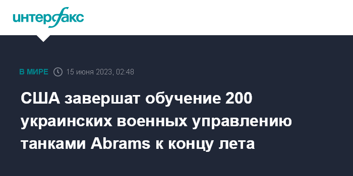 Москва. 15 июня. INTERFAX.RU - Около 200 украинских военнослужащих завершат обучение эксплуатации танков M1A1 Abrams под американским руководством к концу лета, сообщает CBS News со ссылкой на представителей министерства обороны США.