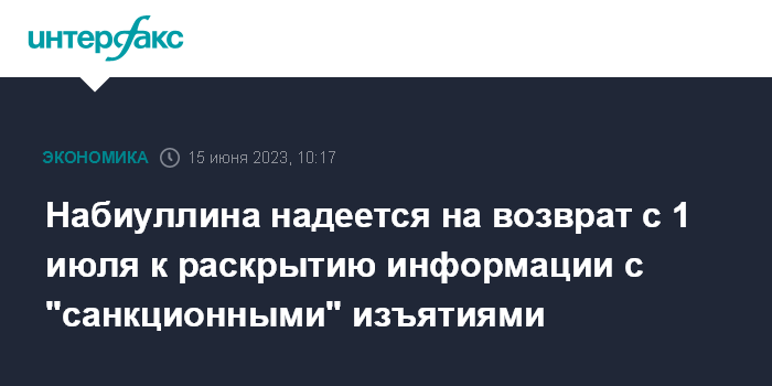 Москва. 15 июня. INTERFAX.RU - Банк России рассчитывает на возврат к раскрытию информации эмитентами с 1 июля 2023 года за исключением чувствительных к санкциям данных, это продемонстрирует заинтересованность в развитии рынка капитала, заявила председатель ЦБ РФ Эльвира Набиуллина на сессии "Как будет развиваться российская экономика" в рамках ПМЭФ.