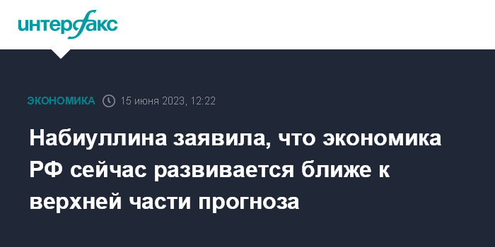 Москва. 15 июня. INTERFAX.RU - Российская экономика сейчас развивается ближе к верхней границе апрельского прогноза ЦБ, предусматривающего рост ВВП в 2023 году на 0,5-2%, сообщила журналистам председатель Банка России Эльвира Набиуллина в кулуарах ПМЭФ.