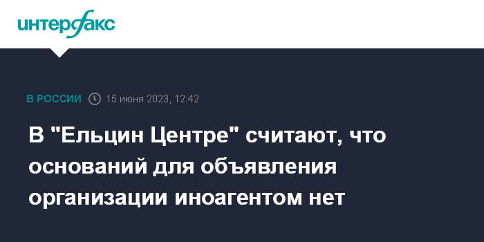 Москва. 15 июня. INTERFAX.RU - В "Ельцин Центре" спокойно отнеслись к информации о проверке организации на предмет наличия иноагентской деятельности, сообщила "Интерфаксу" официальный представитель центра Евгения Капитонихина.