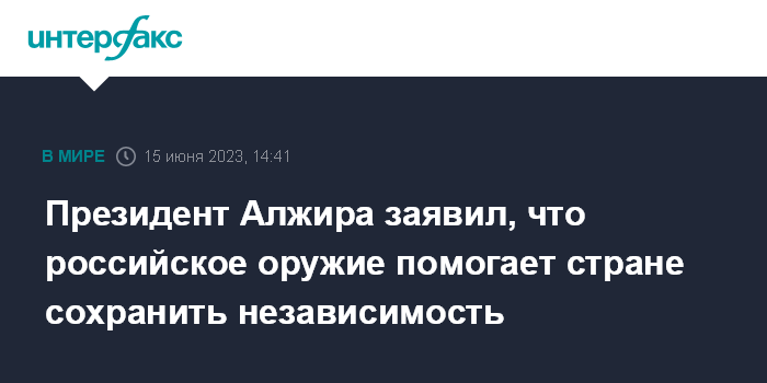 Москва. 15 июня. INTERFAX.RU - Президент Алжира Абдельмаджид Теббун заявил, что поддержка России, в том числе обеспечение республики оружием, позволяет сохранять ей независимость и никакое давление извне не повлияет на алжиро-российские отношения.