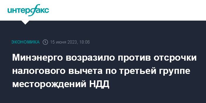 Москва. 15 июня. INTERFAX.RU - Минэнерго против предложения Министерства финансов отложить с 2024 на 2027 год налоговые вычеты для месторождений по третьей группе НДД.