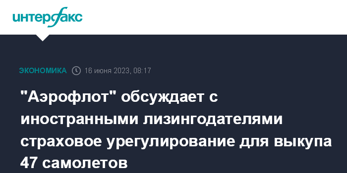 Москва. 16 июня. INTERFAX.RU - "Аэрофлот" ведет переговоры с иностранными лизингодателями о "страховом урегулировании" по 47 находящимся в операционном лизинге самолетам, сообщил глава компании Сергей Александровский. В дальнейшем перевозчик сможет выкупить эти воздушные суда.