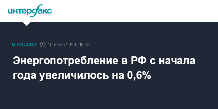Москва. 16 июня. INTERFAX.RU - Увеличение энергопотребления в России с начала года составляет 0,6%, сообщил журналистам в кулуарах ПМЭФ-2023 министр энергетики Николай Шульгинов.