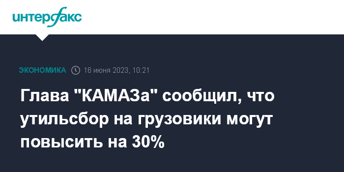 Москва. 16 июня. INTERFAX.RU - Правительство РФ обсуждает индексацию утилизационного сбора на автомобили для грузовой техники в размере порядка 30%. ПАО "КАМАЗ" на этом фоне готово до конца года не повышать цены на свою продукцию, сообщил журналистам гендиректор компании Сергей Когогин в кулуарах ПМЭФ-2023.