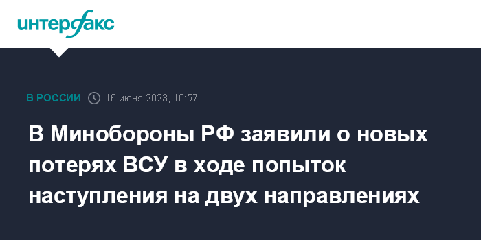 Москва. 16 июня. INTERFAX.RU - Украинские военные продолжают попытки наступления на южно-донецком и донецком направлениях, заявил официальный представитель Минобороны РФ Игорь Конашенков.
