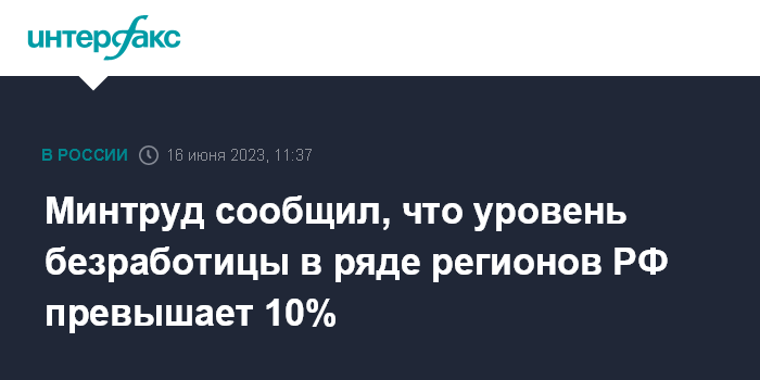 Москва. 16 июня. INTERFAX.RU - Уровень безработицы в ряде субъектов РФ превышает отметку в 10%, сообщил министр труда и социальной защиты России Антон Котяков.