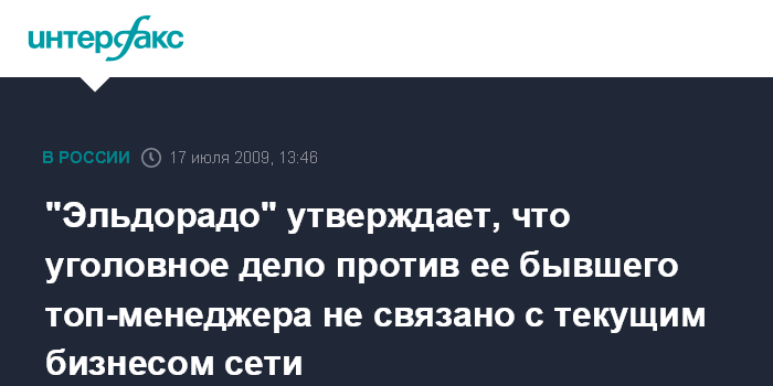 Москва. 17 июля. INTERFAX.RU - Розничная сеть "Эльдорадо" утверждает, что уголовное дело против ее бывшего топ-менеджера Александра Шифрина, которого в пятницу генпрокуратура объявила в международный розыск, не имеет отношения к бизнесу компании.