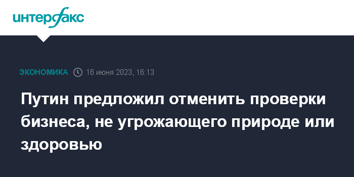 Москва. 16 июня. INTERFAX.RU - Президент РФ Владимир Путин предложил отменить любые проверки в отношении бизнеса, который не представляет никакой угрозы и рисков для граждан и окружающей среды, и ограничиваться профилактическими мерами.