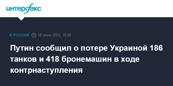 Москва. 16 июня. INTERFAX.RU - В ходе так называемого контрнаступления в районе проведения специальной военной операции Украина уже потеряла более 180 танков и свыше 400 бронемашин, заявил президент РФ Владимир Путин.