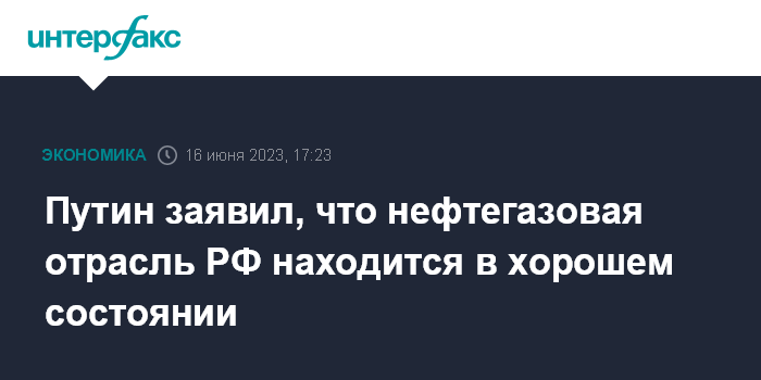 Москва. 16 июня. INTERFAX.RU - Российская нефтегазовая отрасль в хорошем состоянии и имеет перспективы развития, заявил президент РФ Владимир Путин в ходе выступления на ПМЭФ-2023.