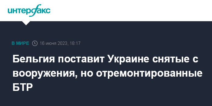 Москва. 16 июня. INTERFAX.RU - Совет министров Бельгии одобрил передачу Украине бронетранспортеров для перемещения личного состава, сообщила RTBF министр обороны Людивин Дедондер.
