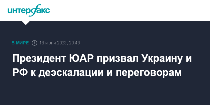 Москва. 16 июня. INTERFAX.RU - Президент ЮАР Сирил Рамафоса в пятницу в ходе визита в Киев призвал Украину и Москву к урегулированию конфликта путем переговоров, сообщают западные СМИ.