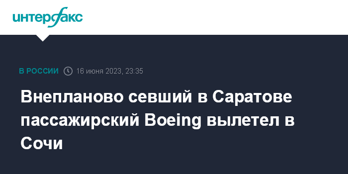 Москва. 16 июня. INTERFAX.RU - Следовавший из Москвы в Сочи самолет Boeing-737, который совершил незапланированную посадку в аэропорту "Гагарин" в Саратове, вылетел по месту назначения.