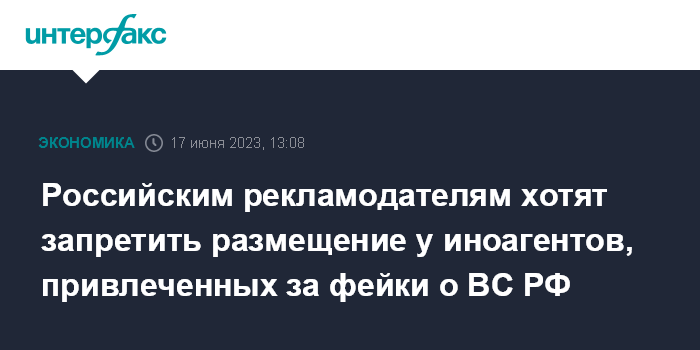 Кроме того, Минцифры предлагает ввести запрет на размещение рекламы у автора со статусом иноагента, которого привлекли к ответственности за распространение фейков о ВС РФ.