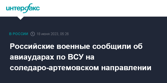 Москва. 18 июня. INTERFAX.RU - Российская авиация нанесла ракетные и бомбовые удары по опорным пунктам и военной технике вооруженных сил Украины (ВСУ) на соледаро-артемовском направлении, заявил начальник пресс-центра группировки "Юг" Вадим Астафьев.