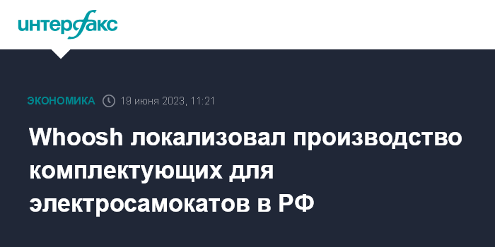 Москва. 19 июня. INTERFAX.RU - Сервис кикшеринга Whoosh (ООО "ВУШ Холдинг") локализовал производство комплектующих для электросамокатов в России, рассчитывает за счет этого во II полугодии сэкономить порядка 20% бюджета по этой статье, говорится в сообщении компании.