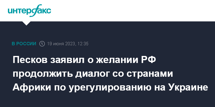 Москва. 19 июня. INTERFAX.RU - Диалог с представителями африканских стран по их мирной инициативе по урегулированию на Украине будет продолжен, заявил пресс-секретарь президента РФ Дмитрий Песков.