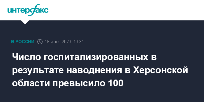 Москва. 19 июня. INTERFAX.RU - Более 100 жителей Херсонской области госпитализированы в результате затопления прибрежных территорий после разрушения инфраструктуры Каховской ГЭС, сообщил врио губернатора Владимир Сальдо.