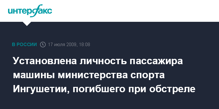 Назрань. 17 июля. INTERFAX.RU - Выяснена личность пассажира автомобиля министерства спорта и туризма Ингушетии, который погиб в результате обстрела машины неизвестными в пятницу утром.