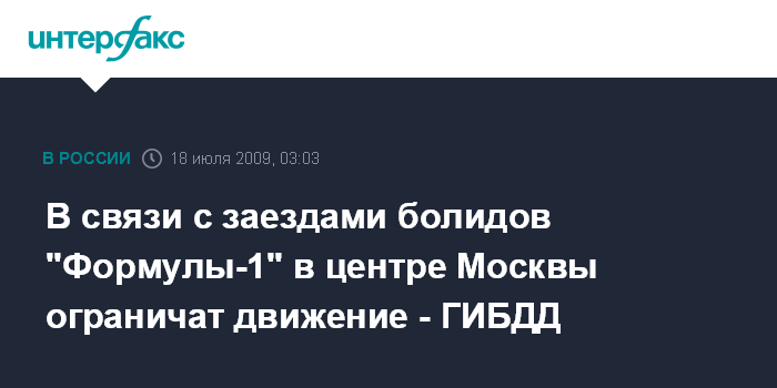 Москва. 18 июля. ИНТЕРФАКС-МОСКВА - В связи с заездами болидов "Формулы-1" в центральной части Москвы 18, 19 и 20 июля будет ограничено движение автотранспорта, в том числе общественного, сообщили "Интерфаксу" в пресс-службы столичной ГИБДД.