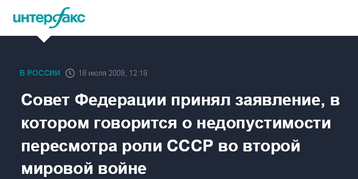 Москва. 18 июля. INTERFAX.RU - Попытки пересмотреть реальные причины второй мировой войны и возложить на СССР равную с гитлеровской Германией ответственность являются оскорблением российского народа, говорится в заявлении Совета Федерации, принятом в субботу.