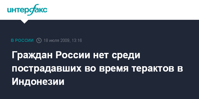 Москва. 18 июля. INTERFAX.RU - МИД России решительно осуждает недавние террористические акты в индонезийской Джакарте и отмечает, что в результате взрывов в двух отелях россияне не пострадали.