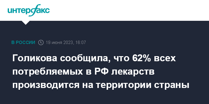 Москва. 19 июня. INTERFAX.RU - Более 60% всех потребляемых в России лекарственных препаратов производится на территории страны; также в РФ создана технологическая возможность производства 82% жизненно важных препаратов, сообщила вице-премьер Татьяна Голикова.