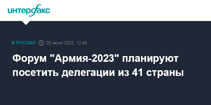 Москва. 20 июня. INTERFAX.RU - Участие в Международном военно-техническом форуме "Армия-2023", который пройдет с 14 по 20 августа, на сегодня подтвердили представители 41 страны, сообщил министр обороны РФ Сергей Шойгу во вторник на заседании коллегии российского военного ведомства.