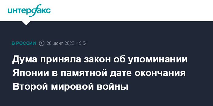Москва. 20 июня. INTERFAX.RU - Госдума во вторник приняла в третьем, окончательном чтении закон, согласно которому памятная дата 3 сентября будет именоваться как "День Победы над милитаристской Японией и окончания Второй мировой войны (1945 год)".