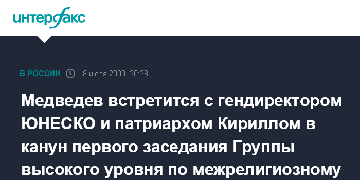 Медведев встретится с гендиректором ЮНЕСКО и патриархом Кириллом в канун первого заседания Группы высокого уровня по межрелигиозному диалогу