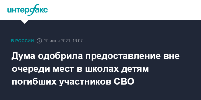 Москва. 20 июня. INTERFAX.RU - Госдума во вторник приняла в третьем, окончательном чтении закон о внеочередном порядке предоставления места в государственных и муниципальных общеобразовательных и дошкольных образовательных организациях и в детских лагерях детям добровольцев и сотрудников Росгвардии, погибших в ходе специальной военной операции.