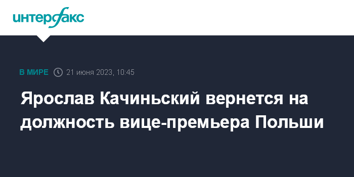 Москва. 21 июня. INTERFAX.RU - Председатель польской партии "Право и справедливость" Ярослав Качиньский вернется в правительство страны в должности вице-премьера, сообщил в среду в эфире Польского радио один из нынешних вице-премьеров Яцек Сасин.