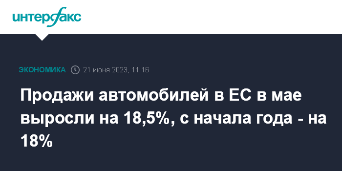 Продажи автомобилей в Евросоюзе в январе-мае увеличились на 18% относительно аналогичного периода 2022 года (до 4,394 млн), в Европе в целом - на 17,4% (до 5,324 млн).