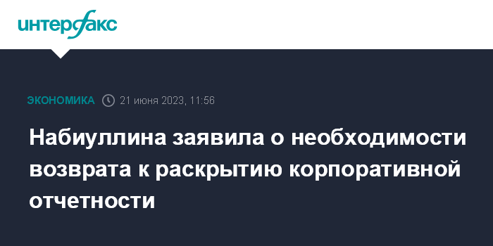Москва. 21 июня. INTERFAX.RU - Банк России настаивает на возврате к публикации корпоративной отчетности с изъятиями по чувствительным темам, важно не скрывать данные, необходимые для развития рынка капитала, сообщила председатель ЦБ РФ Эльвира Набиуллина в ходе выступления на заседании Совета Федерации.