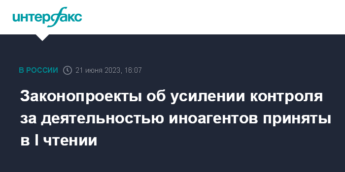 Москва. 21 июня. INTERFAX.RU - Госдума на заседании в среду приняла в первом чтении два законопроекта об усилении контроля за деятельностью лиц, находящихся под иностранным влиянием.