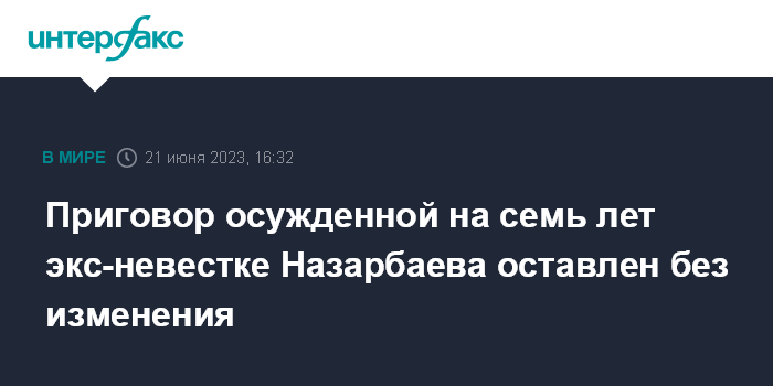 Москва. 21 июня. INTERFAX.RU - Апелляционная инстанция оставила без изменения приговор, вынесенный 4 мая бывшей супруге племянника экс-президента Казахстана Нурсултана Назарбаева - Гульмире Сатыбалды - и ее подельникам, сообщила пресс-служба суда Астаны.