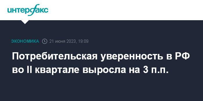 Москва. 21 июня. INTERFAX.RU - Индекс потребительской уверенности, отражающий совокупные потребительские ожидания населения РФ, во II квартале 2023 года вырос на 3 п.п., до минус 15%, сообщил в среду Росстат (опрос был с 1 по 10 мая).