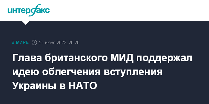 Москва. 21 июня. INTERFAX.RU - Великобритания намерена содействовать облегчению пути вступления Украины в НАТО, заявил в среду глава британского МИД Джеймс Клеверли на конференции по восстановлению Украины.