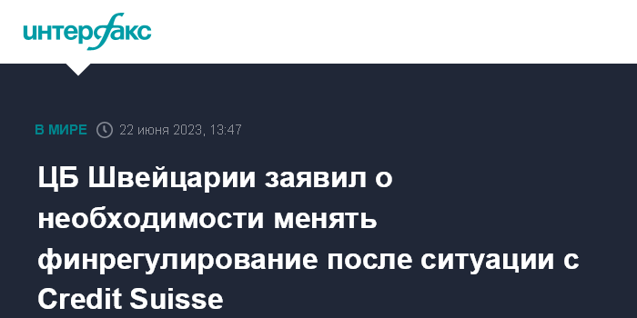 Москва. 22 июня. INTERFAX.RU - Швейцарский национальный банк (SNB, Центробанк страны) заявил о необходимости изменения регулятивной среды после недавней ситуации с Credit Suisse.