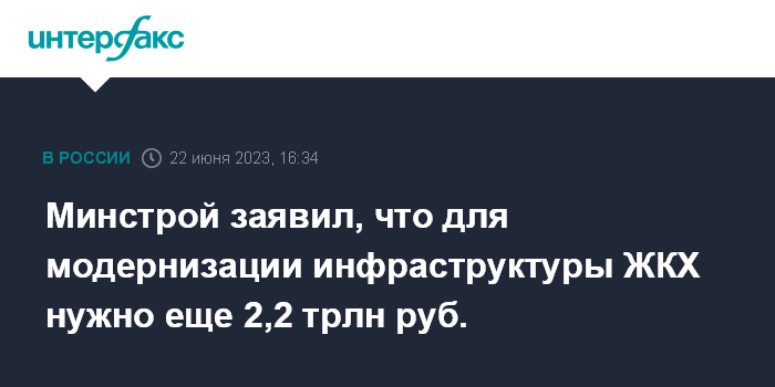 Москва. 22 июня. INTERFAX.RU - Потребность в финансировании модернизации инфраструктуры ЖКХ составляет 2,2 трлн рублей, заявил в четверг глава Минстроя РФ Ирек Файзуллин.