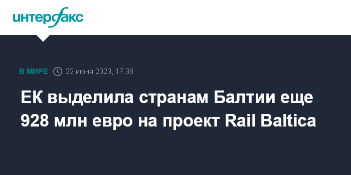 Москва. 22 июня. INTERFAX.RU - Европейская комиссия (ЕК) выделила еще 928 млн евро на развитие проекта железной дороги с колеей европейского стандарта Rail Baltica в странах Балтии, из которых 394 млн евро предусмотрено для Литвы.