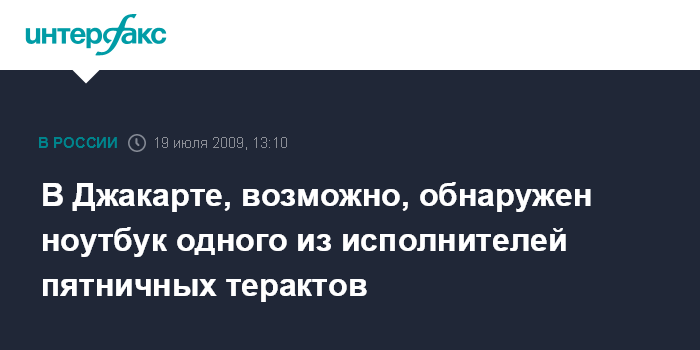 Вашингтон. 19 июля. INTERFAX.RU - Полиция Индонезии, как предполагается, обнаружила ноутбук одного из исполнителей пятничных терактов в отелях "Ритц Карлтон" и "Мариотт" в столице страны Джакарте, сообщает телекомпания Си-Эн-Эн.
