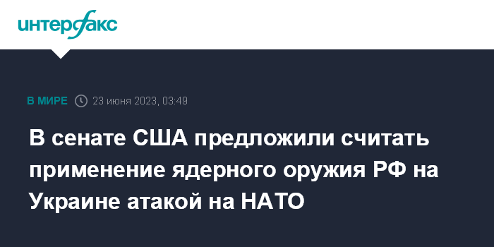 Москва. 23 июня. INTERFAX.RU - В сенате США подготовлена резолюция, которая предлагает рассматривать любое применение Россией или Белоруссией ядерного взрывного устройства на территории Украины как атаку на НАТО, сообщил журналистам сенатор-республиканец Линдси Грэм.