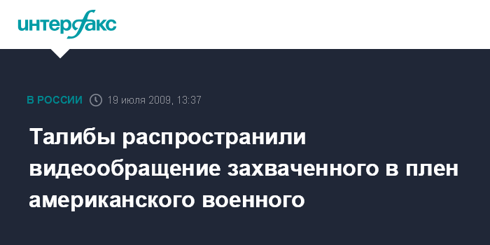 Лондон. 19 июля. INTERFAX.RU - Боевики движения "Талибан" обнародовали видеозапись, на которой запечатлен захваченный в Афганистане в минувшем месяце американский военнослужащий, сообщает британская телерадиокорпорация Би-би-си.