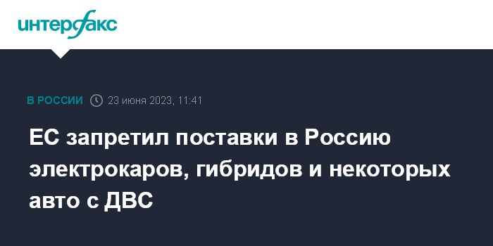 Москва. 23 июня. INTERFAX.RU - Евросоюз в рамках 11-го пакета антироссийских санкций запретил поставки в Россию электромобилей и гибридных автомобилей, а также некоторых автомобилей с двигателями внутреннего сгорания, следует из пресс-релиза, опубликованного на сайте Еврокомиссии.