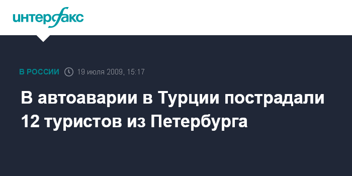 Москва. 19 июля. INTERFAX.RU - Автобус с российскими туристами попал в аварию в Анталье, пострадали 12 человек, восемь из них госпитализированы, сообщает в воскресенье телеканал "Вести".